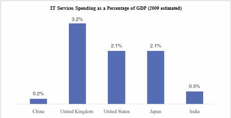 根據IMF調查公布的數據,中國2009年實際GDP增長率為8.5%,2010年將增長9%,是世界上增長最快的國家。然而,中國在 IT 服務上的支出仍然相對較低。根據調查數據和國際貨幣基金組織公布的數據,2009年中國IT服務支出GDP僅為0.2%,而英國為3.2%,美國為< @2.1% 在同一時期。, 2.1% 代表日本,0.5% 代表印度。也可以看出,中國IT服務市場還有很大的增長空間。
