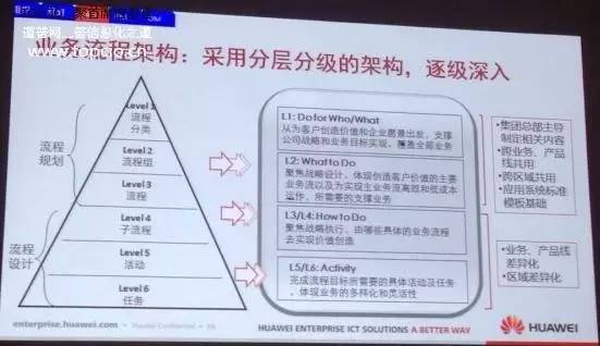 我們有六個層次的流程,目的是為了更好地管理流程和劃分職責。第一層是流程分類,即從為客戶創造價值和企業愿景出發,支撐公司戰略和業務目標的實現,覆蓋所有業務;第二個層次是流程組,側重于戰略設計,反映主要的業務流程和創造客戶價值的流程。為實現主營業務流程,實現主營業務流程的高效低成本運營,所需的配套業務;第三層是流程,第四層是子流程,側重于戰略執行,通過哪些具體的業務流程來實現價值創造;5 級別 1 是活動,級別 6 是任務,即完成流程目標所需的具體活動和任務,體現業務的多樣性和靈活性。三層或三層以上的過程必須是連通的,即固定不變。五層和六層強調靈活性it服務,可以因地制宜。編寫軟件包時,一般是第三層和第四層。