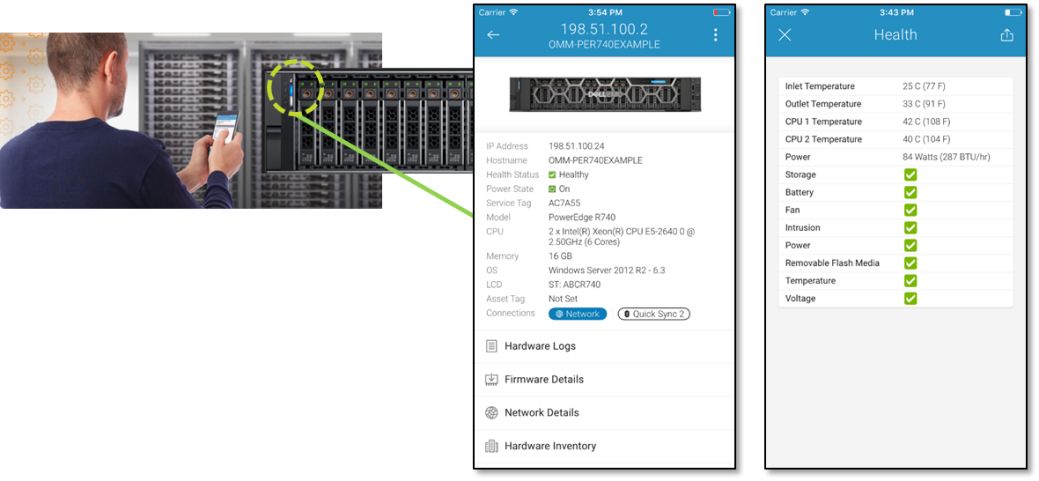 除了PC端的管理和監控,用戶還可以在iOS手機/平板上下載安裝OMM( ) APP,與服務器建立BLE/Wi-Fi連接后,即可輕松查看服務器庫存,健康狀態和日志,甚至重新啟動服務器(需要帶有 Quick Sync 2 模塊的可選面板)。