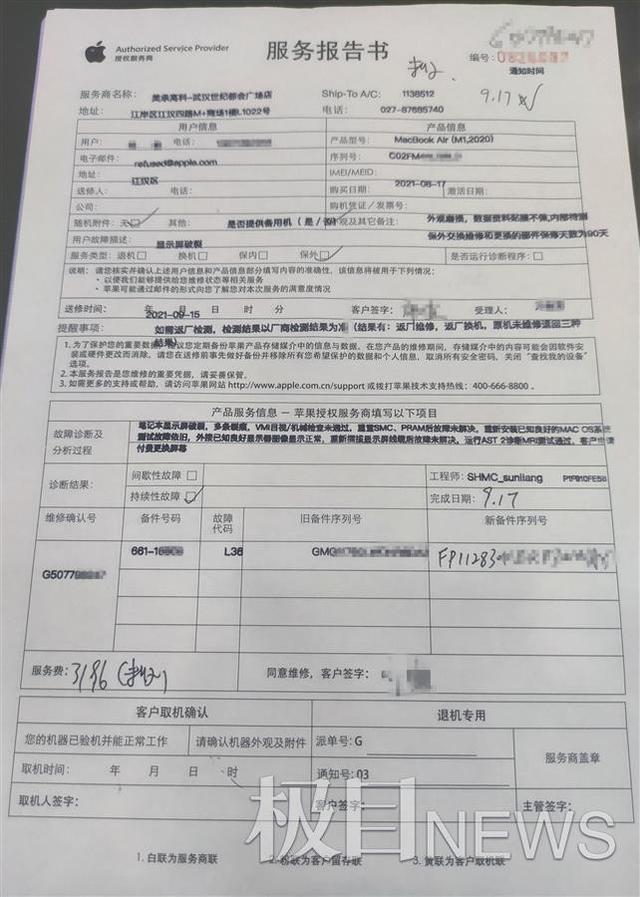 “本以為國(guó)際知名品牌的產(chǎn)品很靠譜,沒(méi)想到用了一個(gè)月就成了‘定時(shí)炸彈’!” 9月18日,站在美成高科武漢世紀(jì)都市廣場(chǎng)店的維修柜臺(tái)前,齊女士怒不可遏。面對(duì)這位蘋(píng)果指定維修商,雖然她極力解釋,但店家始終堅(jiān)稱其送修的蘋(píng)果M1處理器Air筆記本的屏幕裂痕是人為造成的,而且維修費(fèi)更貴。超過(guò)3000元必須由公司支付。齊女士個(gè)人負(fù)責(zé)。